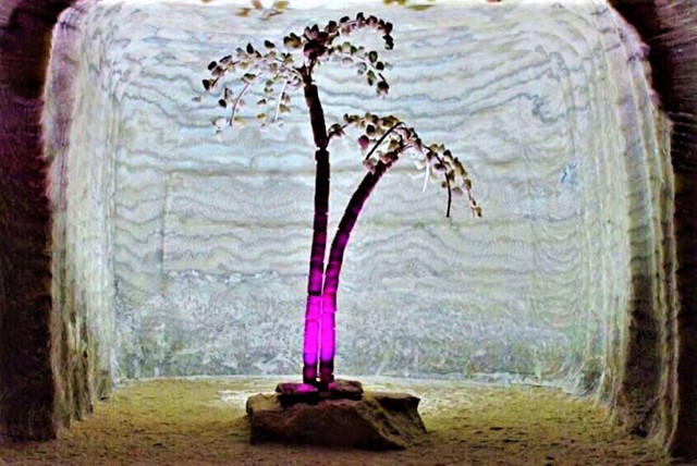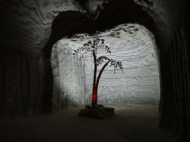 The excursion to the salt mine begins with a rapid descent in the elevator cage to a depth of approximately 300 meters. The labyrinth of the underground city spreads out from the main shaft. Loose salt crackles just under your feet. Salt laces cover the illuminated walls of the tunnels. Everywhere there are bas-reliefs and sculptures carved by folk craftsmen in a layer of salt. In particular, you can see a salt analogue of the famous Donetsk Mertsalov palm tree.