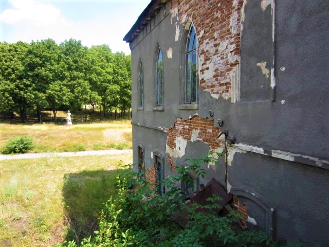 Збереглися палац, службовий корпус, церква, низка господарських споруд. Будівля палацу з подовженими пропорціями у стилі, що поєднує елементи класицизму, романського та готичного стилів, одноповерхова в центральній частині з двоповерховими р ...
