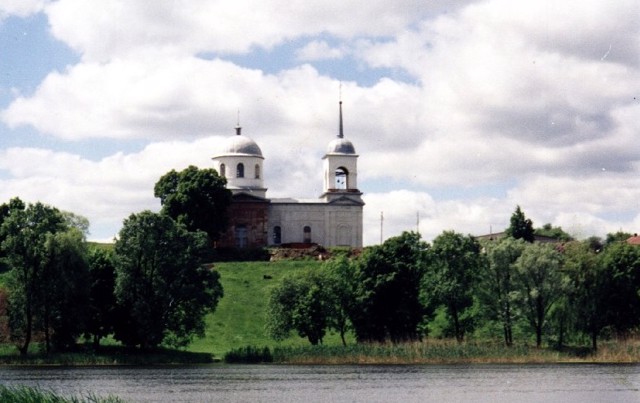 Церква в стилі класицизму стоїть на пагорбі над ставком на одній осі із палацом Святополк-Мирських.