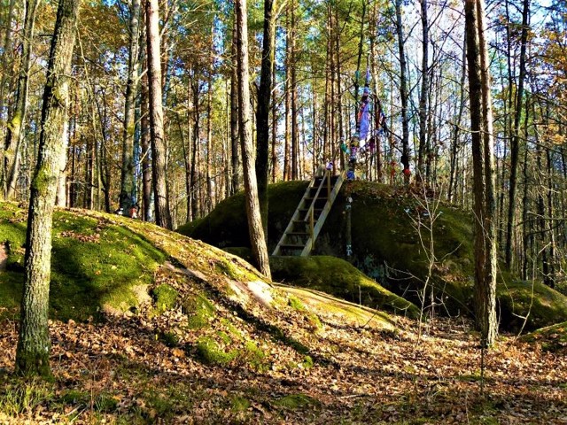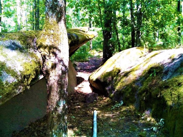 Великі валуни, розкидані серед лісу між сосен і дубів, утворюють "вулиці", на яких є "будинки", "церква" та "школа". На одному з каменів є три заглиблення, що нагадують відбитки людських ніг - "сліди Бога".