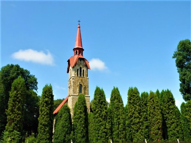 Храм в стиле неоготики имеет высокую островерхую колокольню, которая доминирует над окружающим пейзажем.