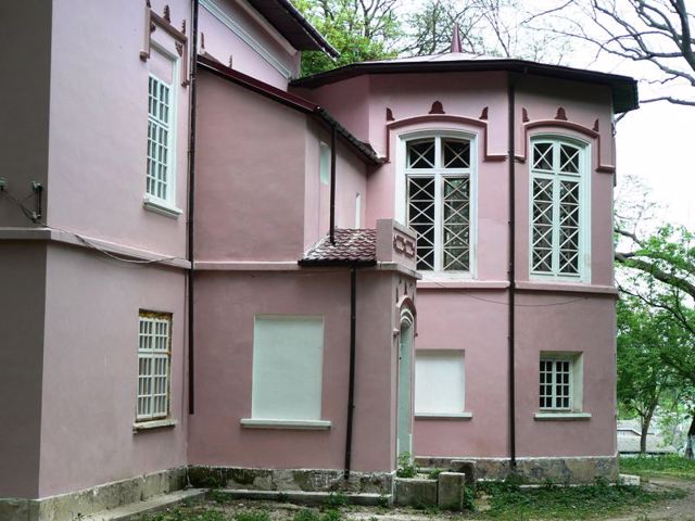 Массивное двухэтажное здание с колоннами и зубчатой башней высотой 17 метров напоминает средневековые европейские замки.
