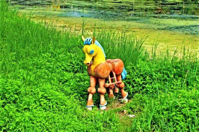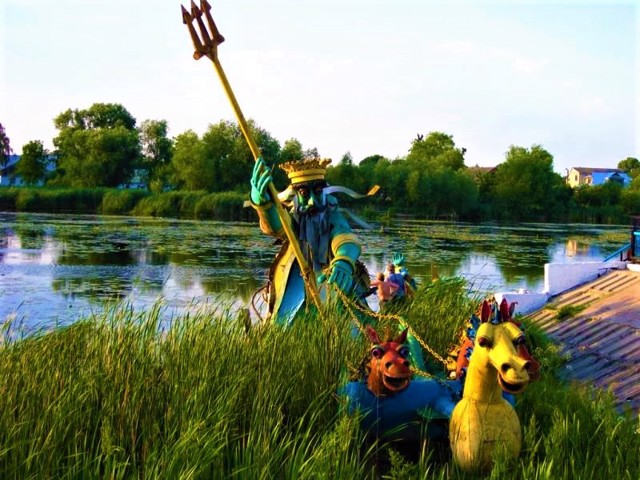 Старокостянтинівську набережну прикрашає яскрава група скульптур з металу та різних деталей машин та механізмів, що зображує казкових героїв: Нептуна у запряженому візку, русалку, комара та інших.