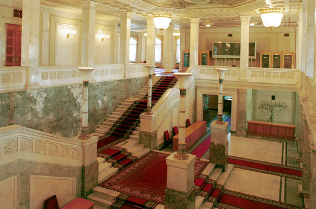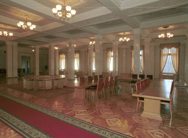 Интерьеры вестибюля и главного фойе оформлены лепниной, инкрустациями и монументальной живописью в стиле соцреализма с элементами украинского народного декоративного искусства. В центральной части здания Верховной Рады Украины - восьмиугольный сессионный зал, перекрытый стеклянным полусферическим куполом.