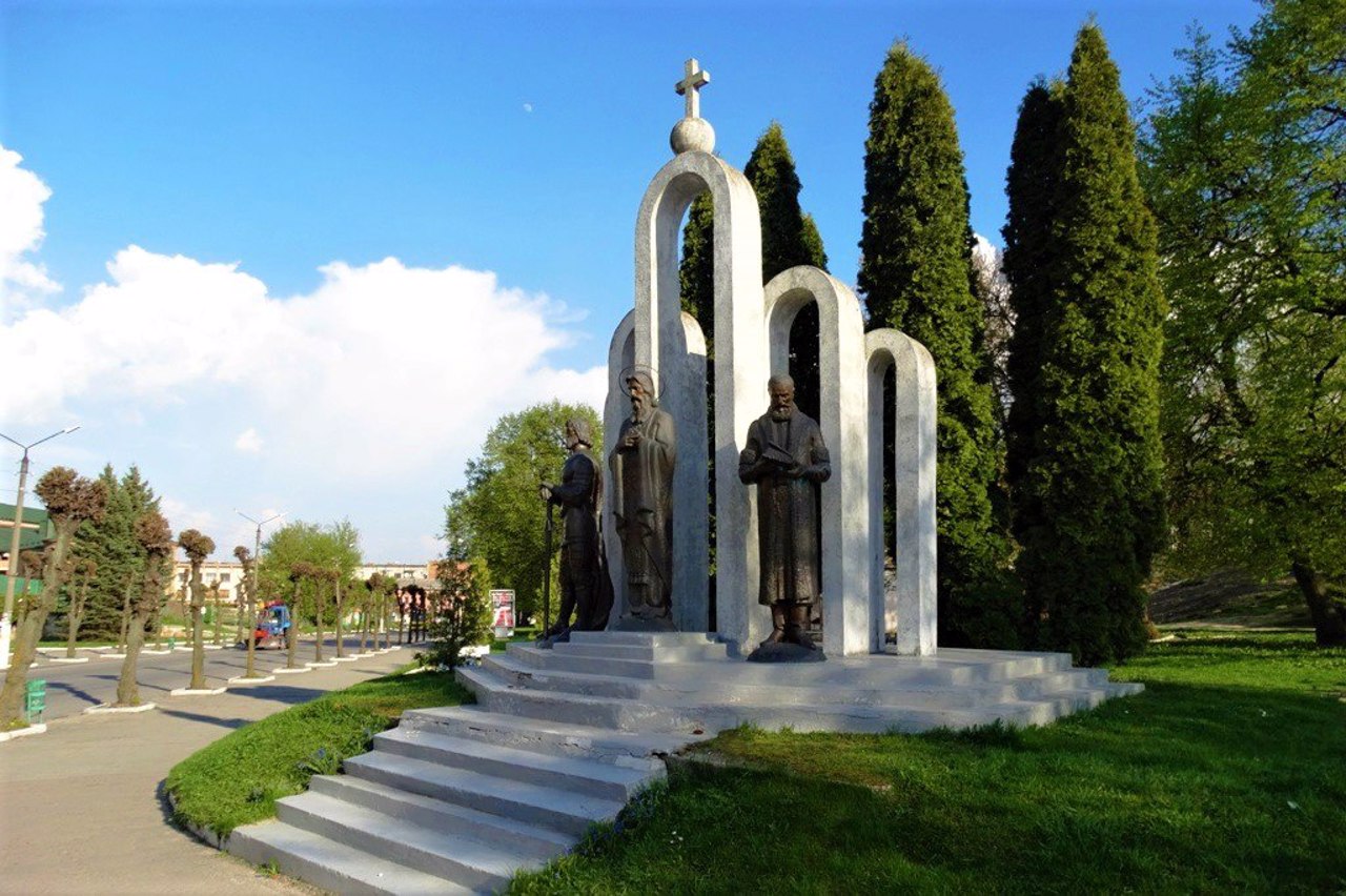 В XIV-XVII веках Острог был главной резиденцией могущественного волынского рода князей Острожских. Фигуры трех самых прославленных представителей рода увековечены на фоне пяти арок, увенчанных крестом.