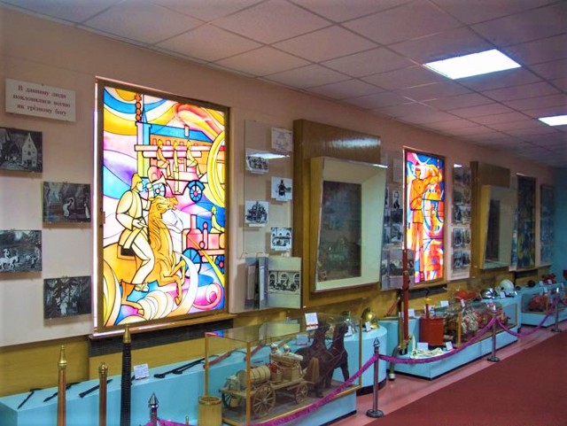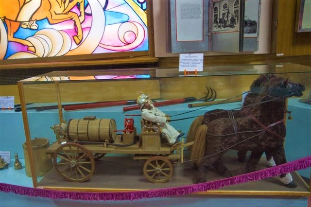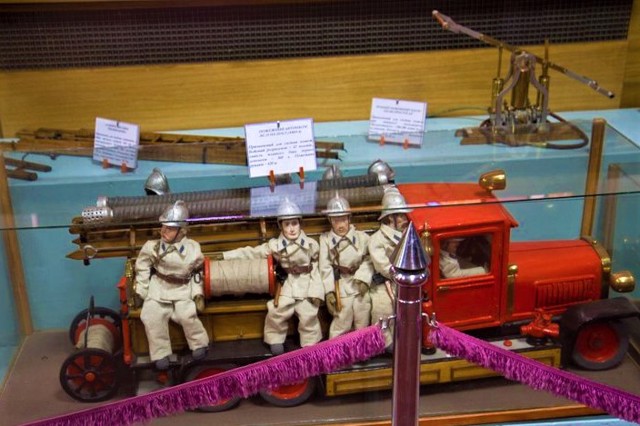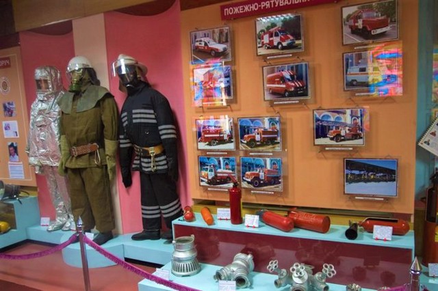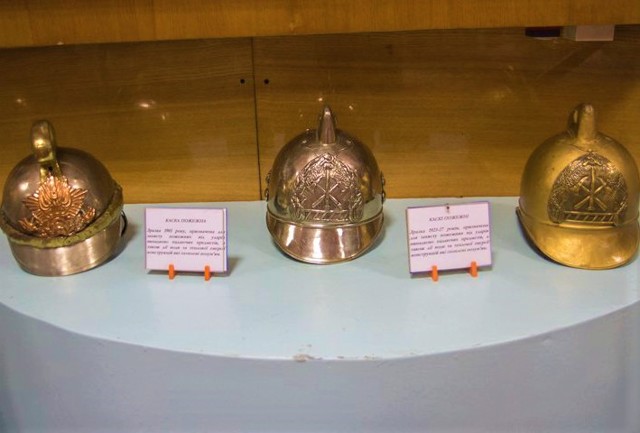 В музее представлена история формирования системы пожаротушения и пожарной техники, на кинопроекторе показывают фильм о причинах возникновения пожаров.