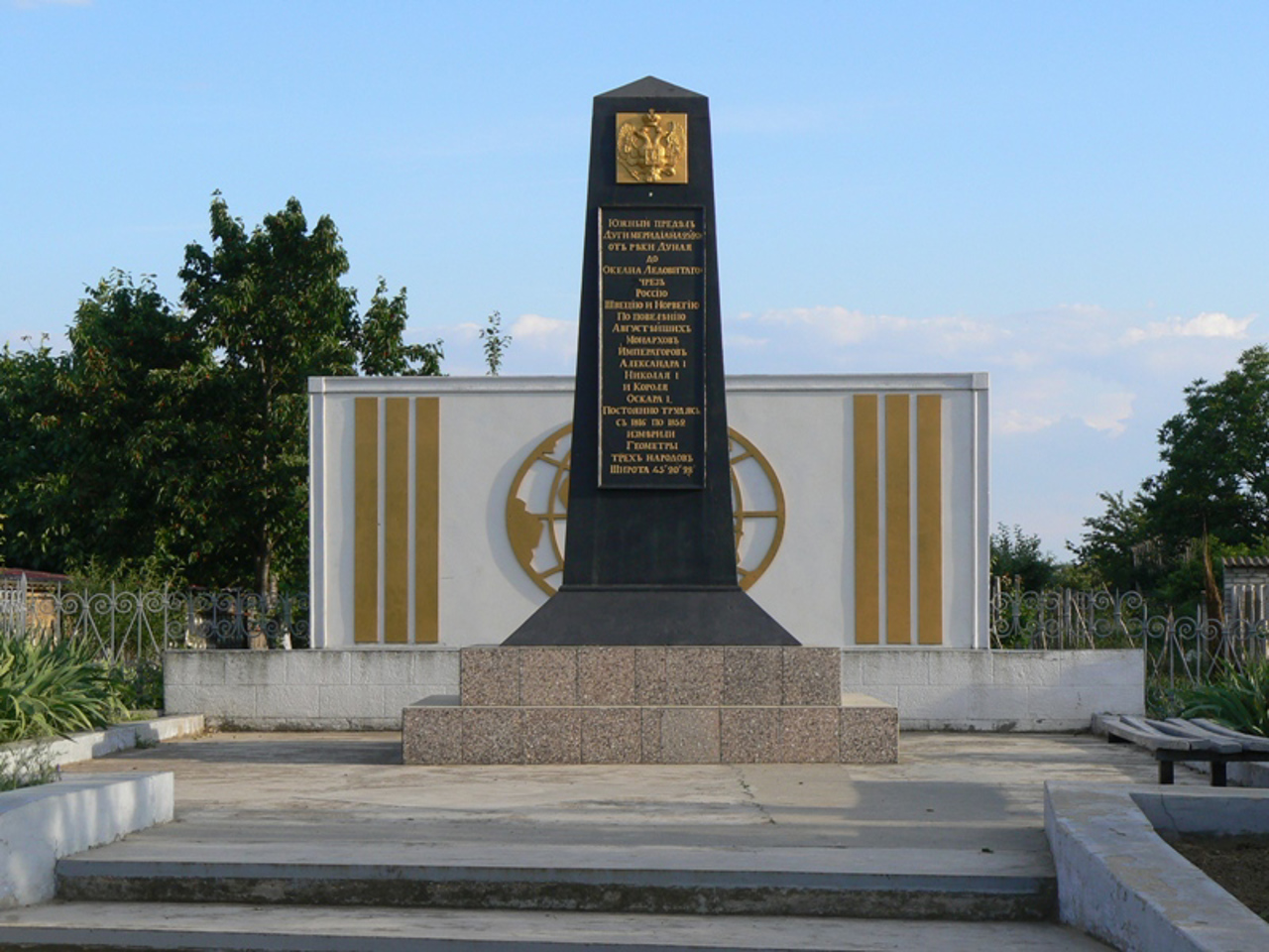 Памятный знак на южной оконечности Дуги Струве в Старой Некрасовке часто называют "Памятником меридиану".