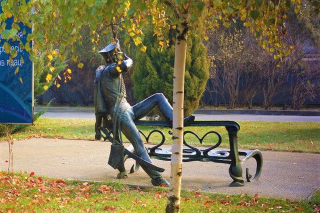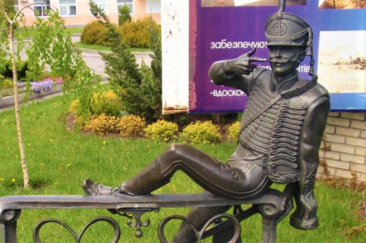 Білоруський скульптор Володимир Жбанов зобразив поручика Ржевського, що недбало сидить на спинці лавочк ...