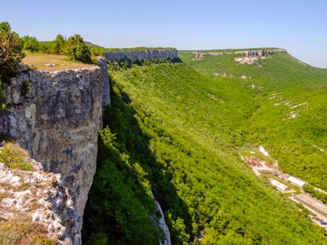 Городище раннесредневекового поселения Кыз-Кермен ("девичья крепость") на плоской вершине одноимённой столовой горы над селом Машино, рядом с руинами Тепе-Кермена.