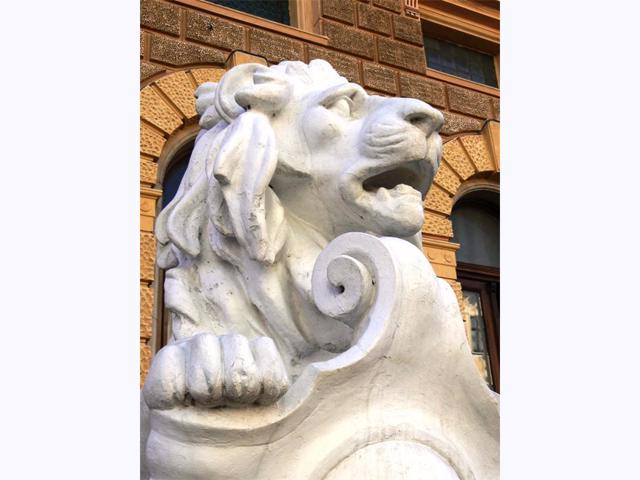 Головний вхід охороняють два леви, за що Палац юстиції прозвали "Будинком із левами".