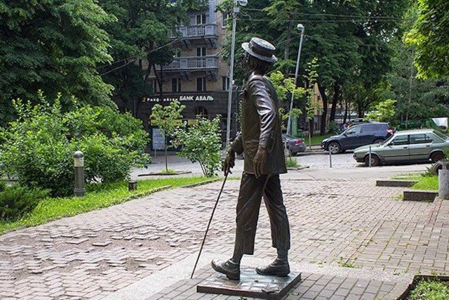 Памятник Михаилу Самуэльевичу Паниковскому, персонажу романа Ильфа и Петрова "Золотой теленок", установлен в центре Киева, в начале улицы Прорезной.