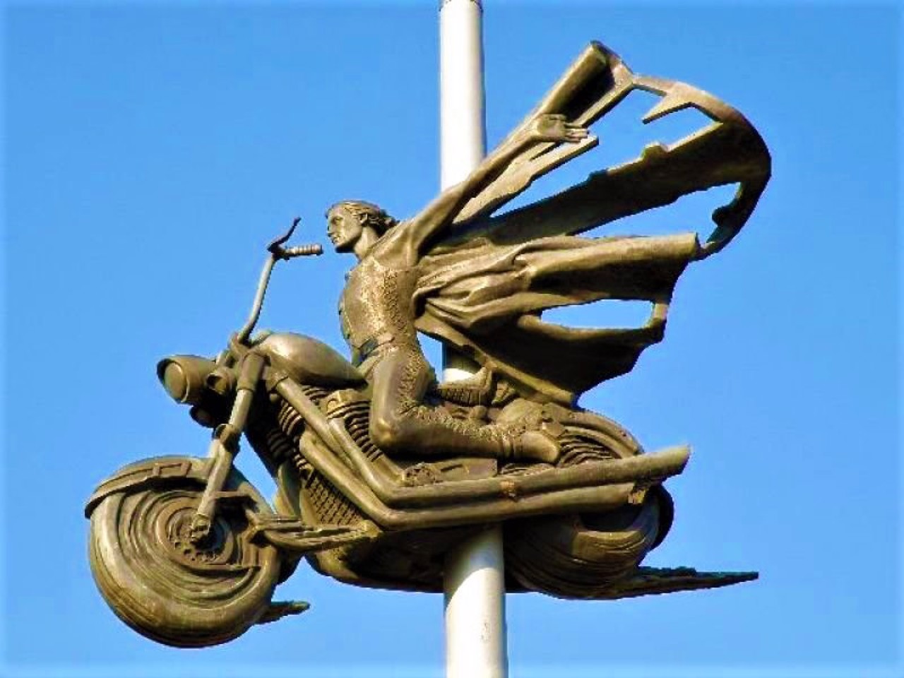 Бронзовая скульптура летящего мотоциклиста (скульптор Антон Маслик) расположена на 7-метровой высоте на бетонной опоре высотой 11 метров. Вертикальная опора и раскинутые руки мотоциклиста образуют крест. Еще один маленький крестик находится на вершине монумента.