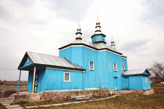 Своими простыми архитектурными формами эта небольшая трехглавая церковь напоминает ранние образцы украинской деревянной архитектуры.