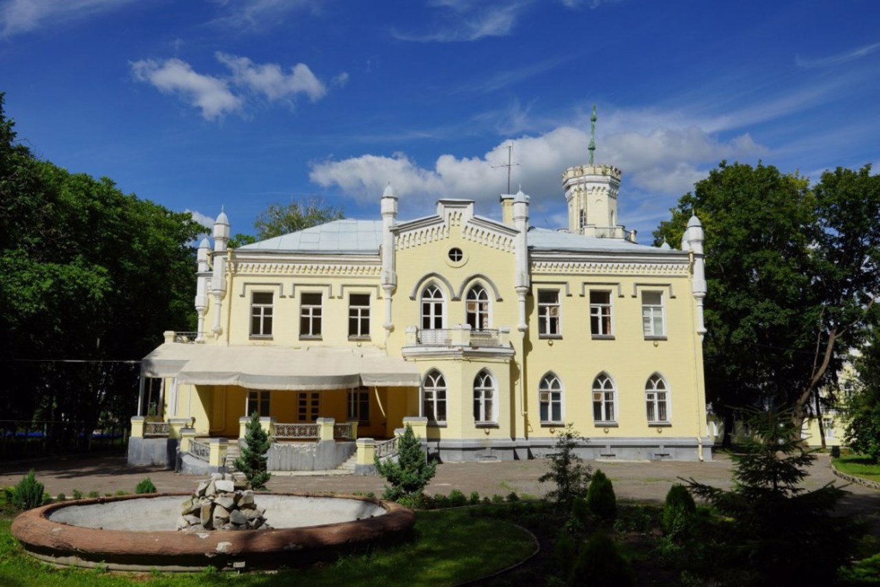 Романтический дворец со сторожевой башней и стрельчатыми окнами украшает бывшую усадьбу графини Прасковьи Штерич (Параскевы Штеричевой), урожденной Донец-Захаржевской.