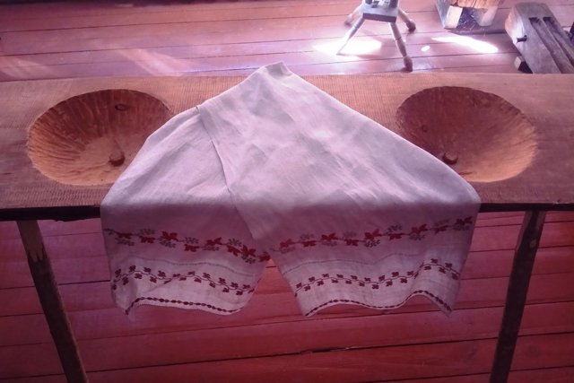 Особое внимание привлекает стол с выдолбленными мисками.