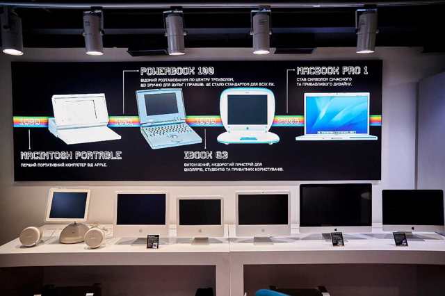 ...Первый в Украине музей продукции компании Apple открылся в 2023 году в центре Киева. Расположен в подвальном помещении сетевого магазина Yabluka, специализирующегося на продаже продуктов Apple.