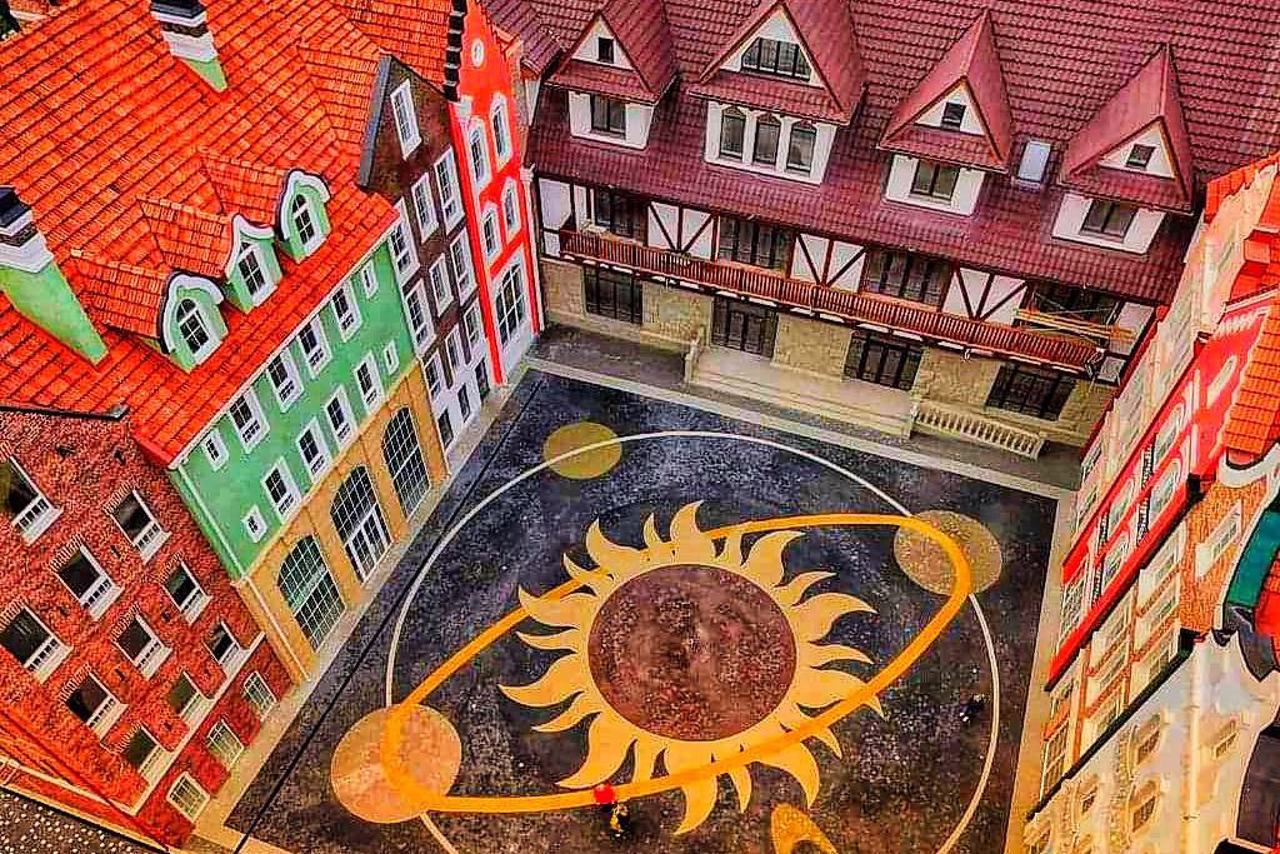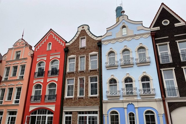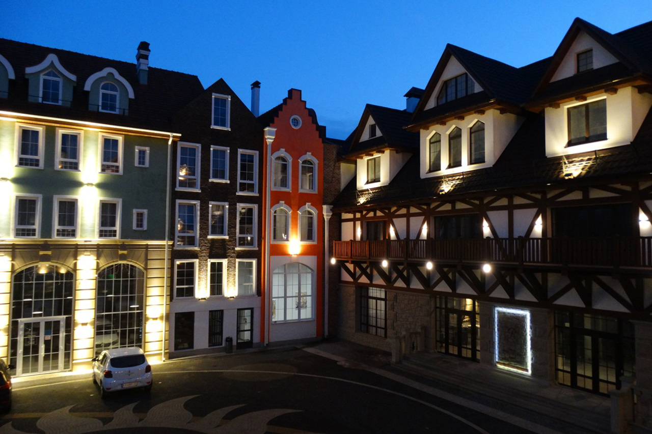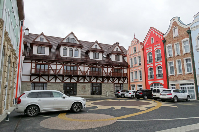 Небольшая мощеная площадь окружена трехэтажными зданиями, напоминающими застройку старого европейского города. Разноцветные и разностилевые фальшфасады имеют польские, немецкие и скандинавские черты.