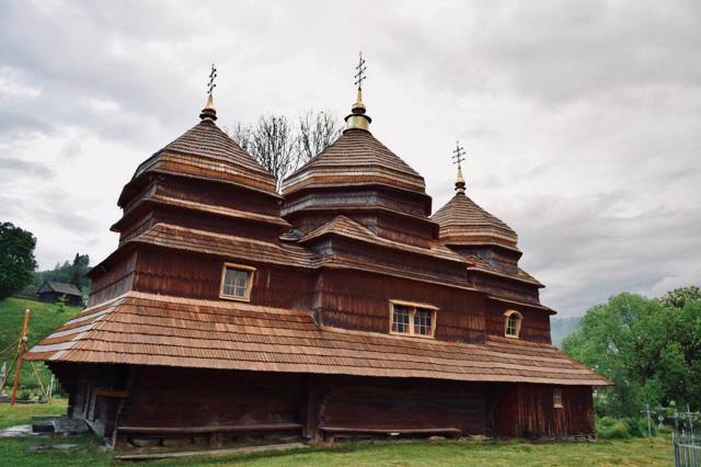 Церква тризрубна, зведена зі смерекових брусів на таких же смерекових підвалинах. Верхи увінчані восьмибічними наметами, завершеними маківками. Церкву оперізує широке піддашшя, оперте на випусти вінців зрубів.