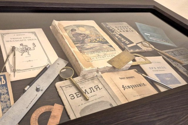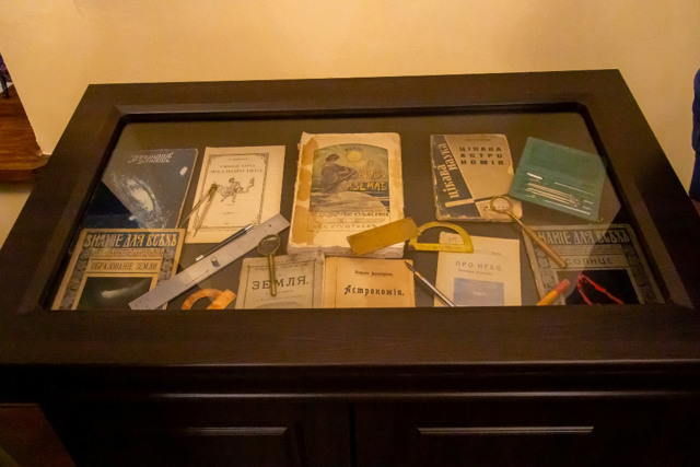 Основу экспозиции составила личная коллекция научного сотрудника университета Юрий Шевели, который уже более 40 лет коллекционирует все, что связано с астрономией, космонавтикой и научной фантастикой: оптические и измерительные приборы, микроскопы, нивелиры, теодолиты, кипрегели, астролябии, секстани угломеры, географические и звездные карты XVIII – начала XX века.