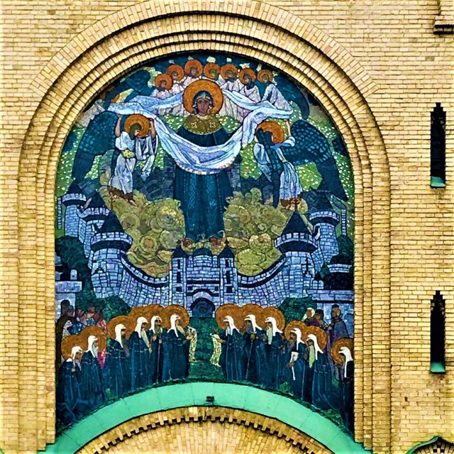 Архітектор Володимир Покровський реалізував проєкт у нетрадиційному для православ'я стилі модерн із використанням архітектурних форм новгородських храмів XIII сторіччя. Монументальні мозаїки "Покрови Богоматері" та "Спас Нерукотворний" виконані за ескізами Миколи Реріха, який дружив із сходознавцем Віктором Голубєвим, одним із братів Голубєвих.