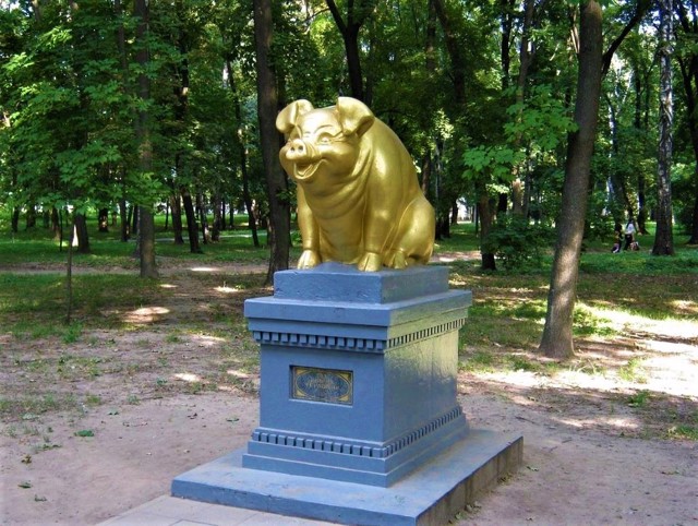 Пам'ятник свині з написом на постаменті "Від вдячних українців" відкрито у міському парку міста Ромни в 2000 році.