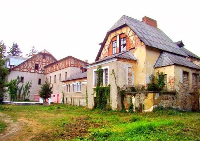 Похмурий палац-шале в оточенні старих ялинок з боку парку нагадує будинок з привидами.