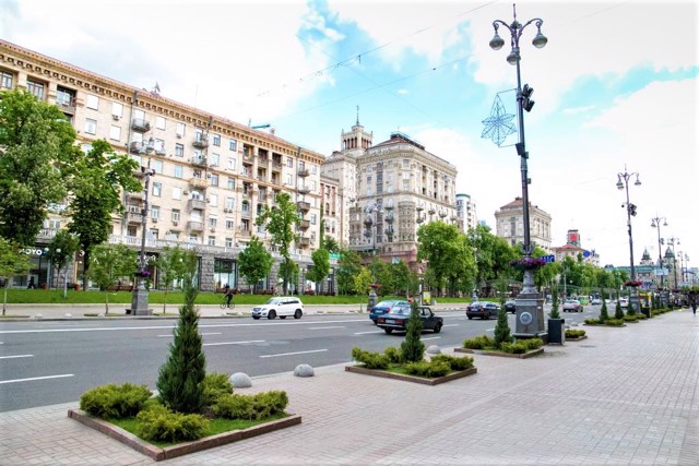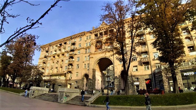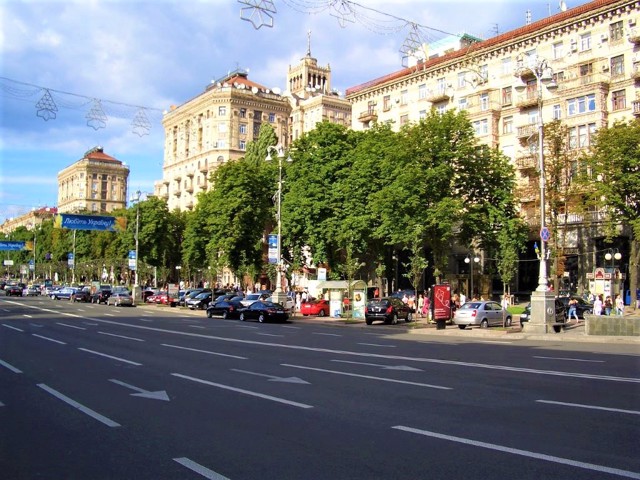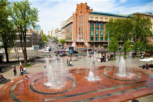 Вулиця Хрещатик починається від Європейської площі, на якій домінує сучасна будівля Українського дому. Квадратна вежа ...