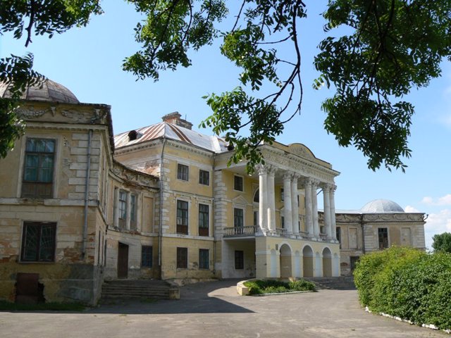 Головний об'єм триповерхового палацу з портиком та фронтоном доповнено бічними галереями, які закінчуються павільйонами. Фасад прикрашений ліпниною: вінками, рослинними гірляндами та коров'ячими черепами (для відведення поганого ока). У палаці 43 кімнати. Найбільш багатим оформленням відрізняються парадні Овальна та Кругла зали 2-го поверху, де зберігся декор.