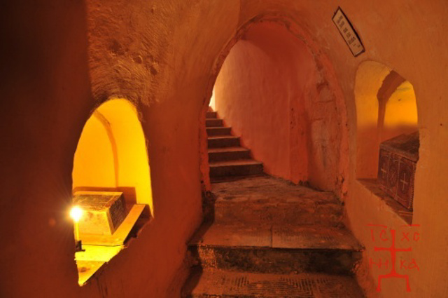 Внутрішній устрій комплексу подібний до печер Києво-Печерської лаври. Неподалік входу в печери виявлено невелику келію, ліворуч від неї - прямий підземний коридор із 40 нішами-усипальницями. Також виявлено печерну церкву. У печерах знайдені кипарисові дошки від гробниць, шиферні плити та плінфа, залишки повстяного та шкіряного взуття, кераміки та інше. На стінах збереглися давньор ...