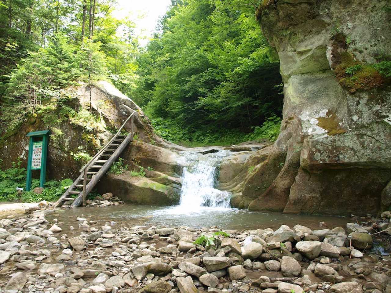 Нижній водоспад каскаду знаходиться в межах села, за 400 метрів від траси. До найбільшого та найкрасивішого водоспаду Великий Гук (18 метрів) потрібно йти 2,5 кілометри через ущелину вздовж потоку. На підході до Великого Гуку ви побачите водоспади Ковбер (3,5 метри), Сич (10,5 метрів), Нижній Гук (9 метрів), Ворота (3,5 метри) та Середній Гук (10,5 метрів).
