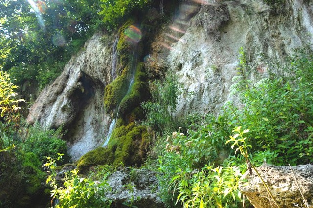 З молодих травертин, що поросли м'ятою та мохом, стікає безліч маленьких струмочків, що утворюють мініатюрний водоспад.