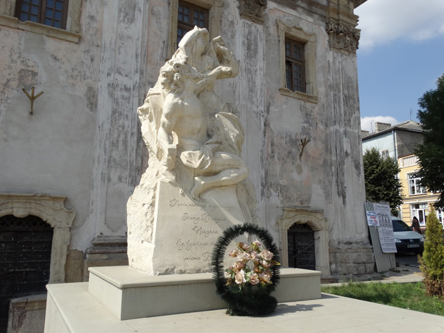 Пам'ятник скульптору в експресивній манері, характерній для школи Пінзеля, створив Роман Вільгушинський. Пінзель зображений з різцем у руці під час роботи над скульптурою Діви Марії. Висота пам'ятника сягає 3 метрів.