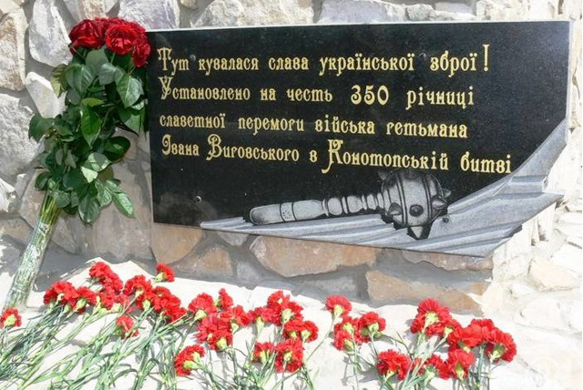 Пам'ятний знак являє собою встановлену на низькому постаменті художню композицію з козацьких шабель, що розрубують щит, і символізує перемогу козацької зброї над ворогом. Напис на памʼятнику: "Тут кувалася слава української зброї! Установлено на честь 350 річниці славетної перемоги війська гетьмана Івана Виговського в Конотопській битві".