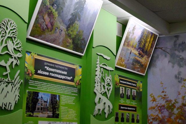 Експозиція Конотопського музею лісу розповідає про флору та фауну Сумської області. Представлені опудала деяких місцевих тварин, зразки деревини тутешніх порід, фото тварин у природі, незвичайні знахідки лісівників, декоративні пано роботи місцевих майстрів.