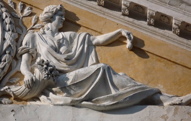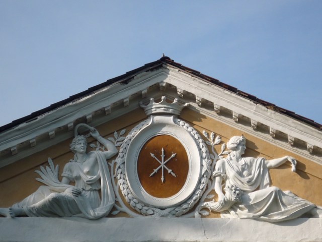 Парадний фасад палацу з білими колонами і левами (сумним і тим, що сміється) біля входу звернений до мальовничого озера.